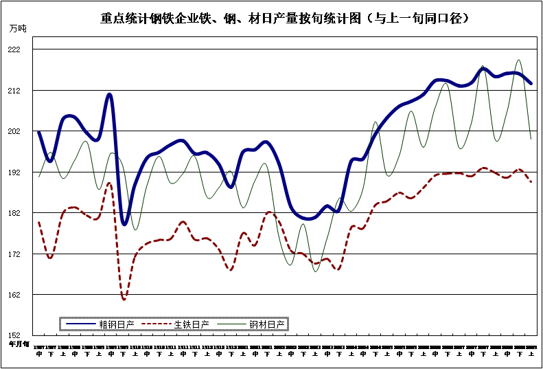 本月重點統計鋼鐵企業累計平均日產粗鋼213.66萬噸,環比下降0.55%、同比增長6.73%;生鐵189.62萬噸,環比下降1.08%、同比增長4.82%;鋼材199.93萬噸,環比下降4.35%、同比增長6.50%。