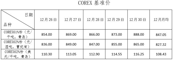 12月26日~12月30日成交48筆共100.38萬(wàn)噸,其中在途4筆共50.8萬(wàn)噸,港口44筆共49.58萬(wàn)噸。主要成交品種包括:PB粉14筆共49.44萬(wàn)噸,金布巴混合粉7筆共4.74萬(wàn)噸,BRBF 4筆13.46萬(wàn)噸,麥克粉2筆共3萬(wàn)噸,紐曼塊1筆共8萬(wàn)噸,F(xiàn)MG混合粉4筆共3.31萬(wàn)噸。